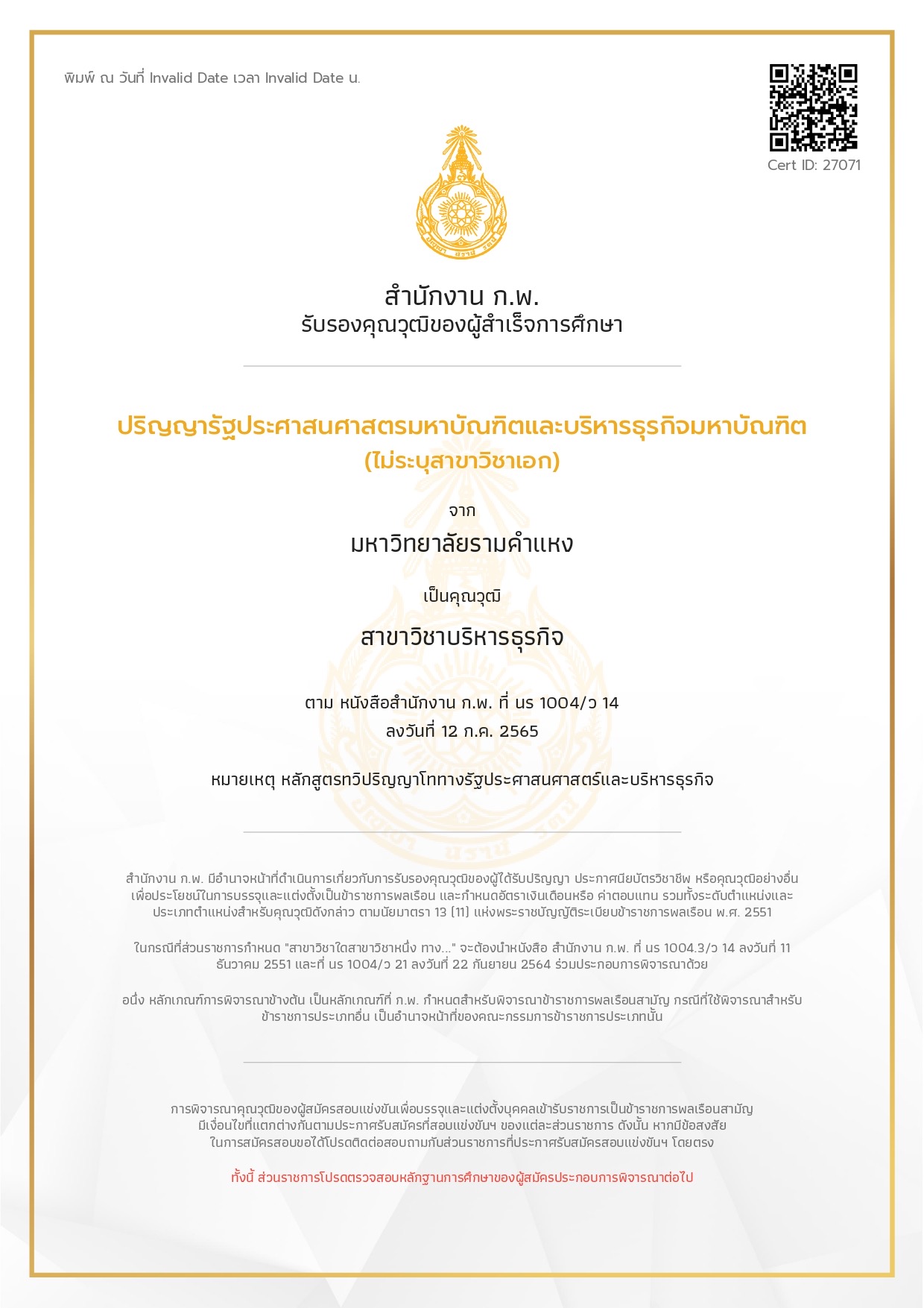 สำนักงาน ก.พ.รับรองคุณวุฒิของผู้สำเร็จการศึกษาปริญญาทางรัฐประศาสนศาสตร์มหาบัณฑฺตและบริหารทางธุรกิจมหาบัณฑิต