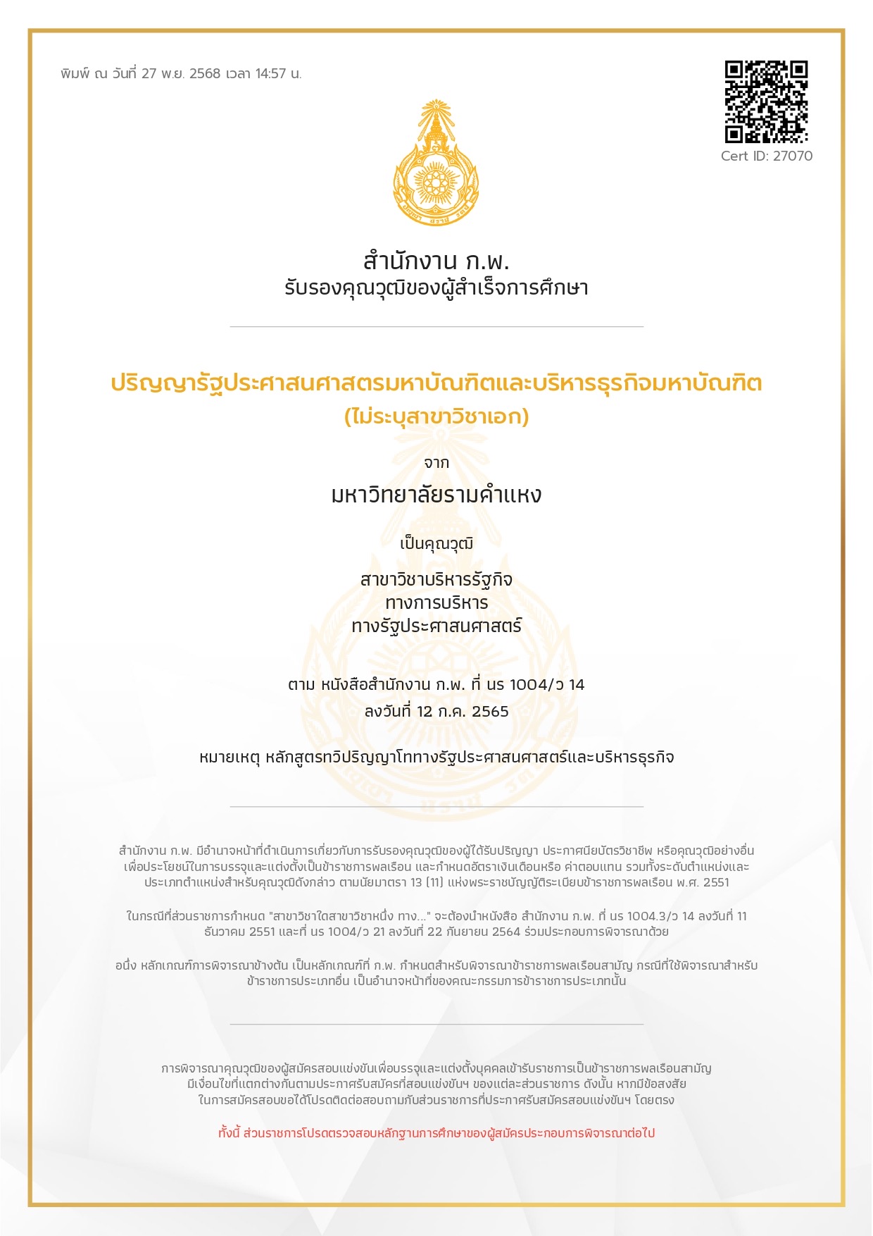 รับรองคุณวุฒิสาขาวิชาบริหารรัฐกิจทางการบริหารทางรัฐประศาสนศาสตร์